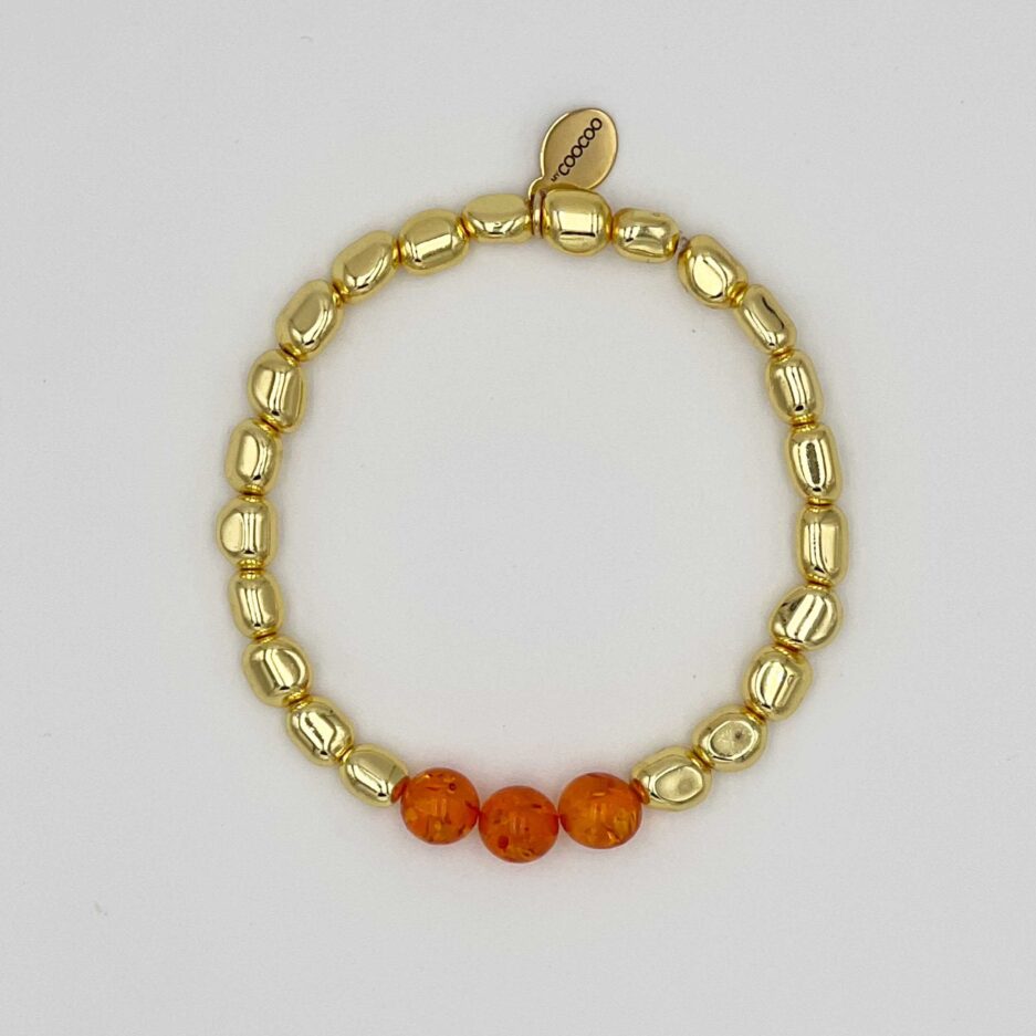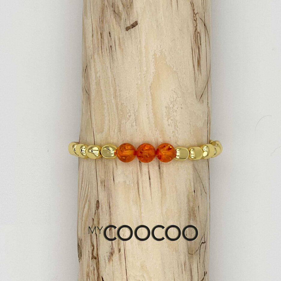 Mit unserem handgefertigten Armband setzt du ein modisches Statement! Es besteht aus 8mm synthetischen Hämatitperlen in besonderer Nugget-Form, die mit 8mm polierten natürlichen honigfarbenen Bernstein-Perlen abwechseln. Das Armband wird durch unseren feinen vergoldeten MyCoocoo-Anhänger aus hochwertigem Edelstahl perfekt abgerundet. Jedes einzelne Armband ist ein Unikat, das frisch, jung und modern wirkt und für jeden Anlass geeignet ist.